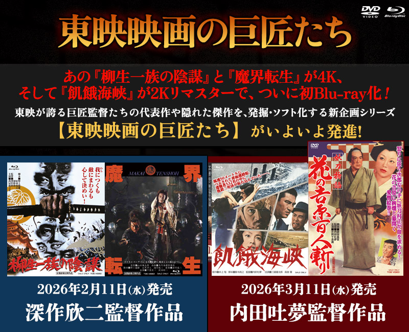 戦前から続く他の大手とは異なり戦後発足した映画会社【東映】は、雑多な出自を持つ者たちによる異種混交のパワーを武器に、価値観が大きく転換してゆく時代のエネルギーを糧にして、急速に成長、すぐれた作品を次々と生み出していきました。 そんな東映映画の傑作を監督ごとに取り上げていく新企画シリーズ【東映映画の巨匠たち】。 第1弾は、深作欣二!東映映画の歴史に燦然と輝く名作『仁義なき戦い』シリーズで知られる深作監督。今回は彼の作品群の中で、異色作とも言える時代劇『柳生一族の陰謀』と『魔界転生』をピックアップ、4K リマスターの高画質にて Blu-ray 化!どちらも根強い支持を誇る傑作、ファン待望の 2 作品を 2026 年 2 月にリリースします!! 第2弾は、内田吐夢!日本映画界屈指の巨匠監督の代表作であり、言わずと知れた【日本映画最高峰】の中の 1本『飢餓海峡』が、ネガスキャン 2K リマスターBlu-ray にて登場!傑作中の傑作が鮮明な画像で甦ります。更には、内田監督の代表作の一つであり、人間の愚かさを絢爛な演出で喝破した名作『妖刀物語 花の吉原百人斬り』が、満を持して DVD 化!プライスオフ DVD2 作品を含む全 4 作品が、2026 年 3 月にリリース決定。 東映映画の巨匠監督たちを Blu-ray&DVD でたどってゆく本シリーズ、ご期待ください!!